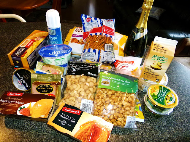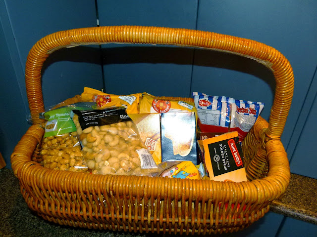 I'm thinking.... nuts, fruit, bottle or two of wine, chocolates, cheese, crackers, pate' etc.